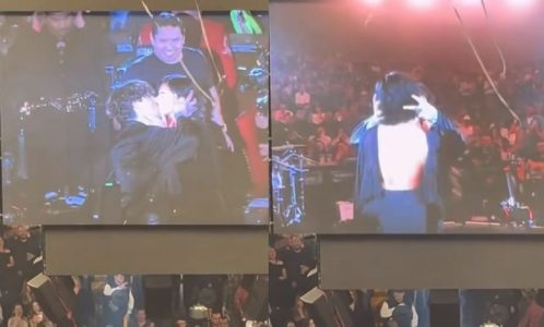 Pero el momento más comentado de la noche llegó cuando Christian Nodal y Ángela Aguilar se dieron un apasionado beso en pleno escenario. Todo ocurrió mientras Julión Álvarez y Ángela se ponían de acuerdo sobre qué tema interpretar juntos. El público comenzó a corear “¡Beso, beso!”, y Julión apoyó la petición entre risas.